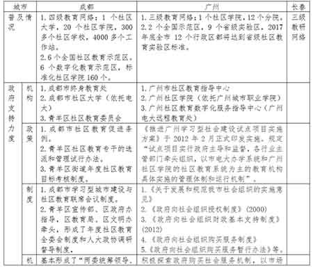 根据对成都、广州以及长春在社区教育普及情况、政府支持力度、师资队伍建设和课程设置、收费情况等方面的对比。主要情况如下: