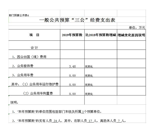 2019年度本单位预算编制18人,工勤编制1人,实有人数17人,退休7人。